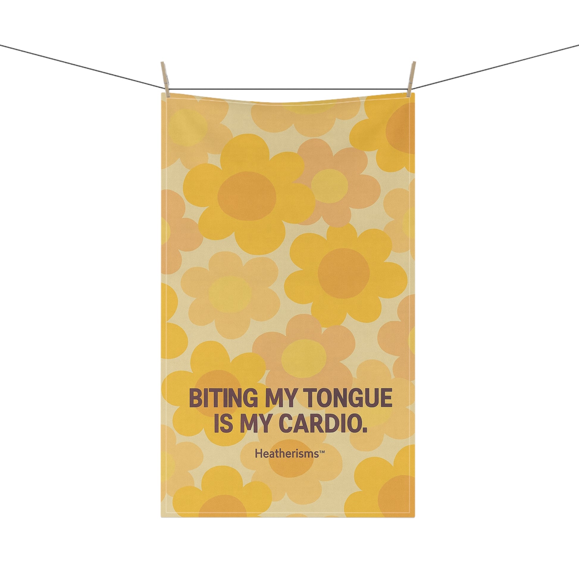 Cheerful Kitchen Tea Towels, Biting My Tongue Is My Cardio, Fun Gift for Cooks, Kitchen Decor, Bright Flower Design, Home Essentials